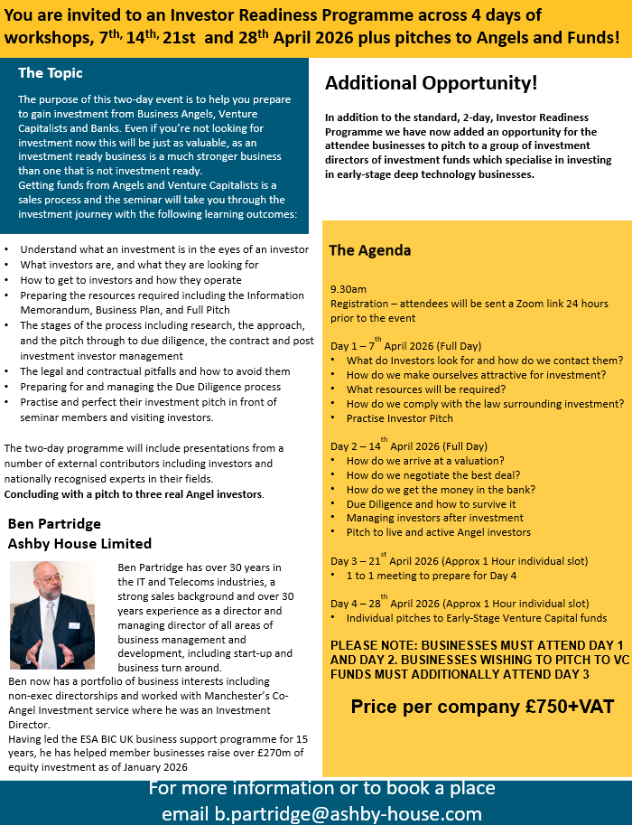 Our next Investor Readiness Workshop will begin on April 7th, get in touch directly to book your place.